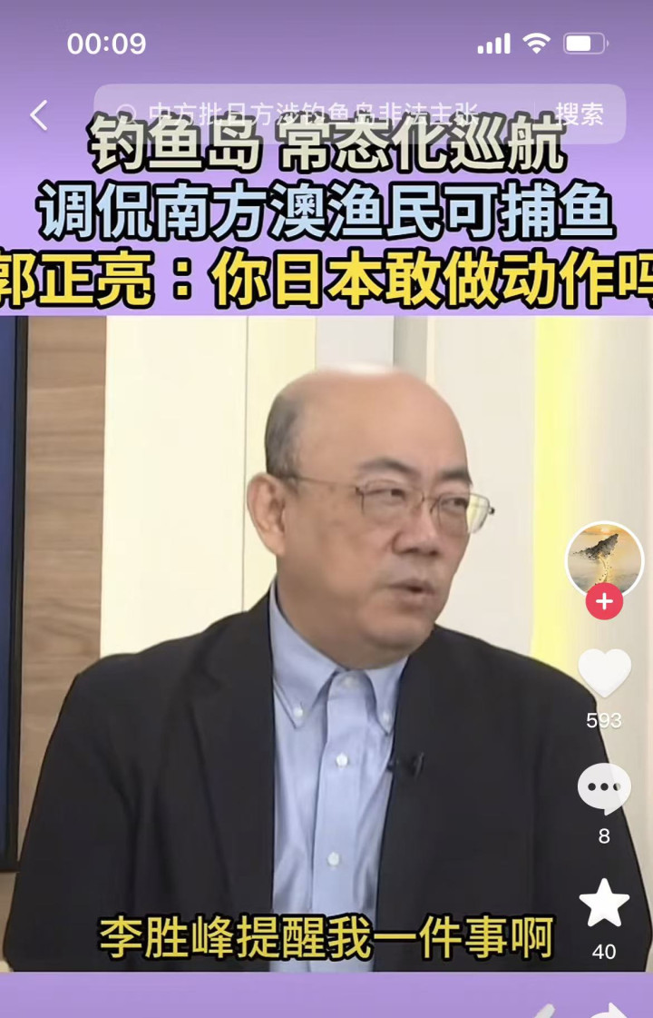 郭正亮说,台湾渔民很聪明,这次只看到中国大陆海警,就放心大胆打鱼,日本执法船不敢来了,钓鱼岛被拿了回来。